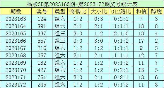 上期回顾:福彩3D第2023172期开奖号码为245,组选类型为组六,奇偶比为1:2,大小比为1:2。