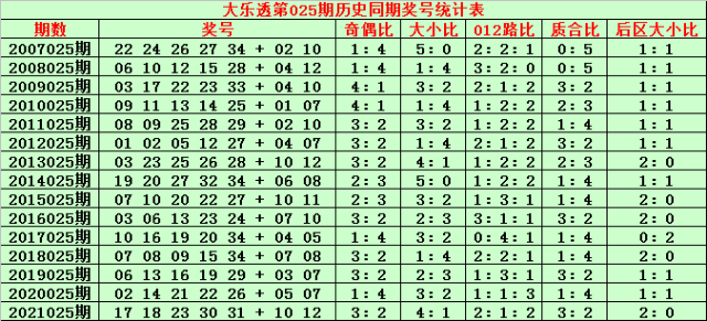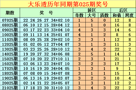 3、在历史同期第025期开奖中,前区号码大小总比例为41:34,大号表现相对较热,本期看好大号继续热出,关注大小比3:2出现;