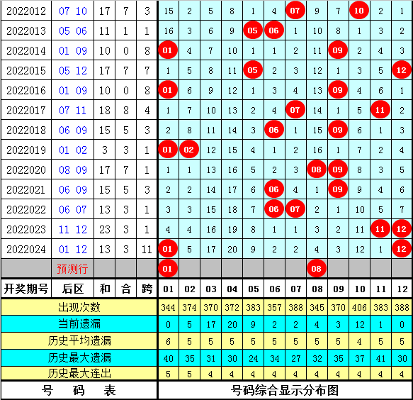 开奖回顾:体彩大乐透第22024期奖号为:01 02 11 30 35+01 12,前区奖号012路比为1:1:3,奇偶比为3:2,大小比为2:3,后区开出一大一小组合。