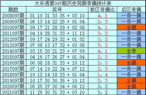 前区第三位:在历史第097期同期开奖中分布范围在13-31区段,平均值为21。1,奇偶比为6:8,去年同期开出偶数号码之后,今年同期预计偶数号码再出,参考号码14。