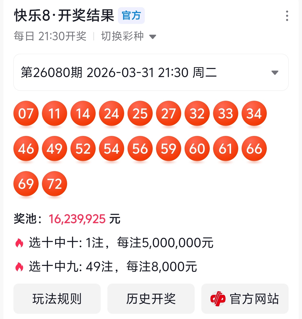 大伙都知道,玩彩票得理性,谁也不能打包票百分百中奖,别人的看法能参考,自己的判断也不能丢。但我这次对2026081期福彩快乐8的分析,那可是下足了功夫!
