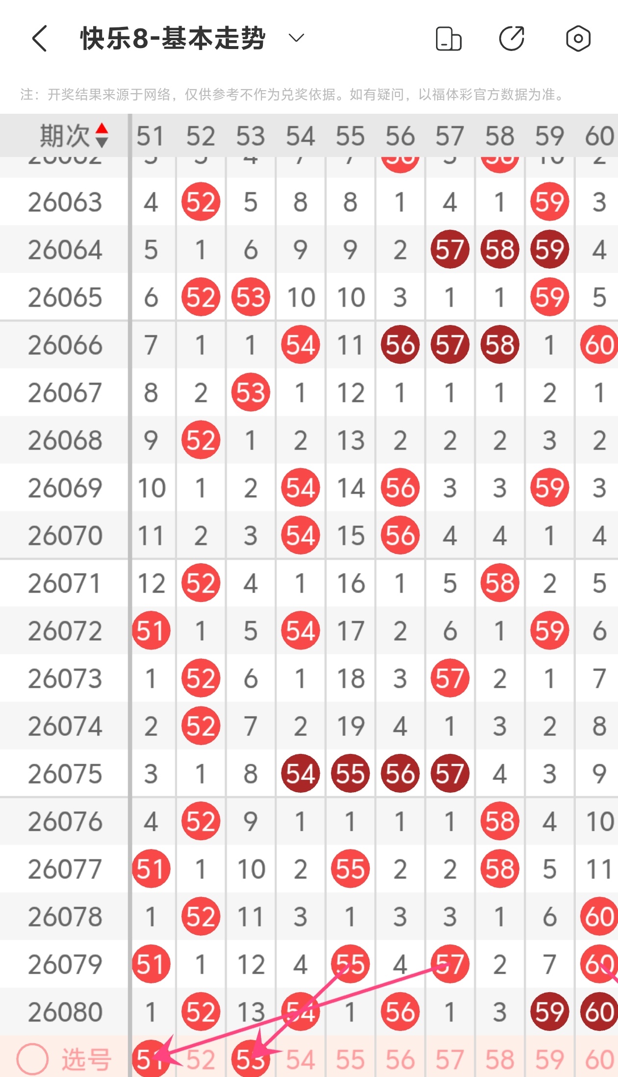 上期第六区间开出52 54 56 59 60,51为斜连走势,53为斜连走势,本期推荐51 53防58