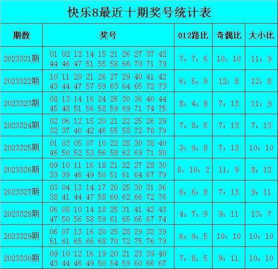 福彩快乐8第2023330期开奖回顾:09 10 12 16 19 20 21 23 39 40 43 44 46 49 50 54 59 60 66 67,其中奖号012路比为7:8:5,1路号码表现活跃。