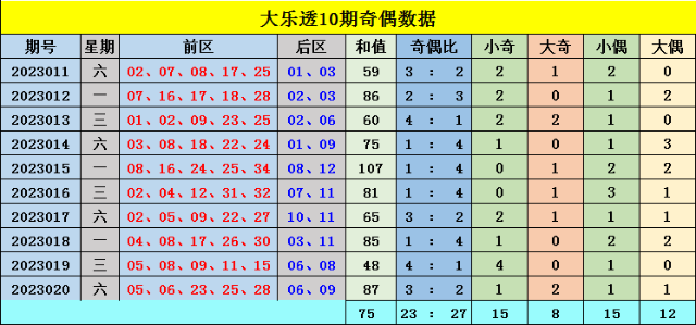 最近10期后区出现的奇偶比为11:9,大小比为10:10。