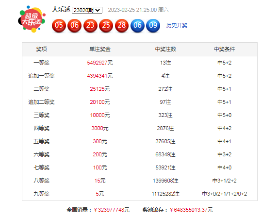 大乐透第23020期开奖。当期开奖号码为:前区05 06 23 25 28,后区06 09。当期前区号码大小比为3:2,奇偶比为3:2,三区比2:1:2,前区开出1组连号05 06;开出1枚重号05;后区开出小大组合06 09。
