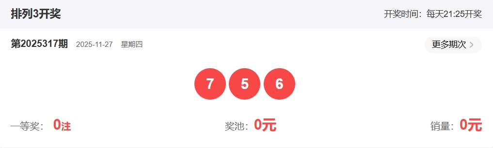 排列三第2025317期开奖回顾:开奖号码:756 形态:组六