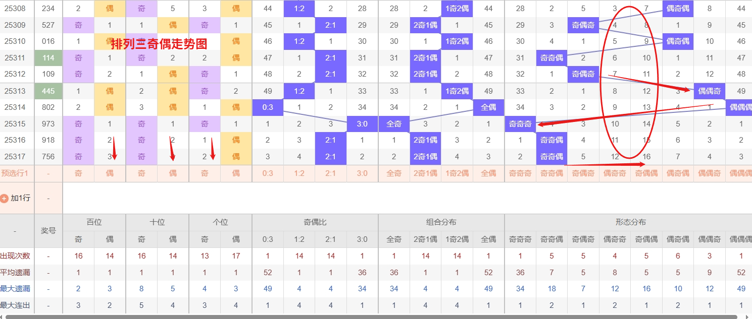 排列三 奇偶分析:从上图可以看出排列三100期内百位奇偶比约为51比49,十位奇偶比为47比53,个位奇偶比为46比54,百位的比值比较均衡,但是个位的比值偏差就有点大,历史奇偶形态近2期开出奇奇偶后下一期的走势为,第234期开出奇奇偶后235期开偶偶奇, 第245期开出奇奇偶后第246期开奇偶偶,第252期开出奇奇偶后第253期开偶奇奇,近期排列三奇偶走势分析,偶偶奇组合目前处于温态阶段,但出现频率已有明显增高的趋势,各项指标显示其能量正在积聚,极有可能从温转热,成为下一阶段重点开出的组合之一,值得优先关注。而偶奇奇作为近期持续走热的热号组合,虽然热度有所波动,但基于其稳定的出号惯性,短期内仍有连续出现的可能,须防范以防其持续热出。采取“抓温转热,兼顾热号延续”的双轨策略,将偶偶奇作为主攻方向,同时为偶奇奇保留适当防守仓位,所以排列三2025318期奇偶形态推偶偶奇与偶奇奇。本文由彩虹多多钱是生命动力所著,请勿转载