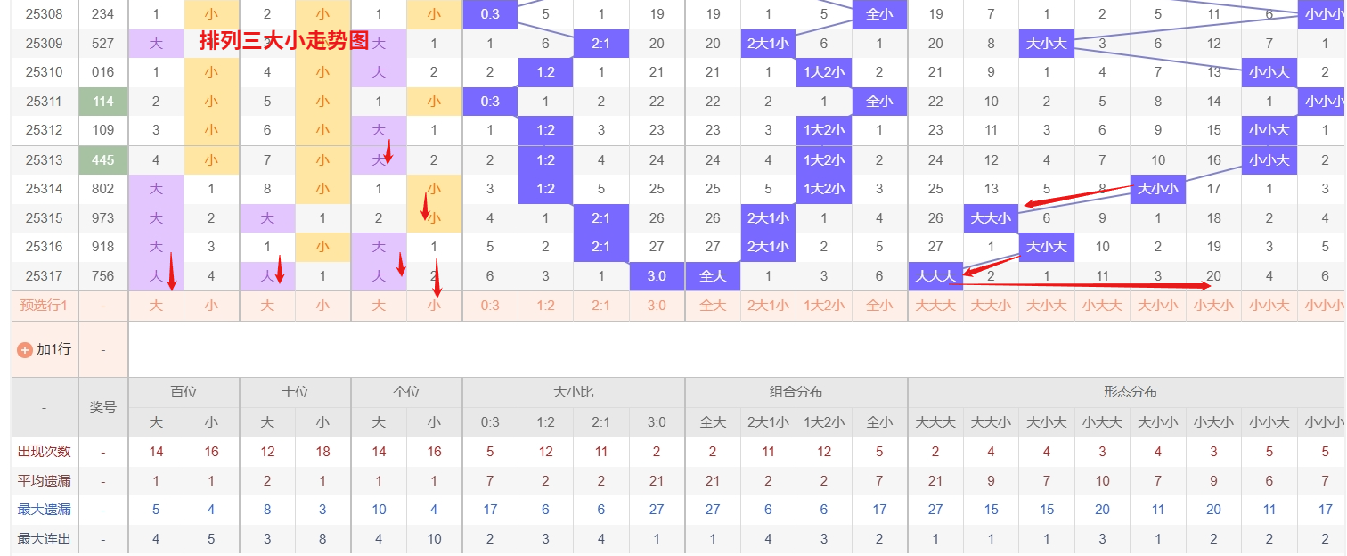 排列三 大小形态分析:从大小走势图上可以看出排列三100期内百位大小比约为54比46,十位大小比约为48:52,个位大小比约为51比49,除了个位和百位奇数比偶数多,十位是偶数比奇数多。历史数据近2期开出大大大下一期的走势为,第245期开出大大大第246期开小小大。第257期开出大大大后第258期继续开大大大,第264期开出大大大后265期开大大小。近期排列三大小走势分析,小小大与大大小组合正呈现强势热出态势,两者交替开出形成明确的热点区域,这种活跃势头显示出充足的动能,短期内极有可能继续连下或轮番出现,是当前需要重点跟踪的方向。而大大大组合虽然刚刚开出一次,打破了长期遗漏的僵局,但考虑到其此前经历了极长的冷态周期,按照“冷号回补”的规律,单次开出往往不足以完全释放其累积的遗漏压力,后续极有可能进入短期内的快速回补阶段,因此绝不能因其刚开出而忽视。采取“追热防回补”的复合策略,在重点关注小小大、大大小热态延续的同时,对大大大组合的再次开出保持警惕,所以排列三第2025318期大小形态推荐小小大防大大小。本文由彩虹多多钱是生命动力所著,请勿转载