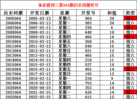 2023年3月15日排列三第064期开奖,历史同期分别开出奖号: