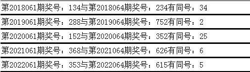 与前期历史同期奖号对比分析,在最近五年开奖中,第061期同期奖号与第064期同期奖号都出现了相同号码: