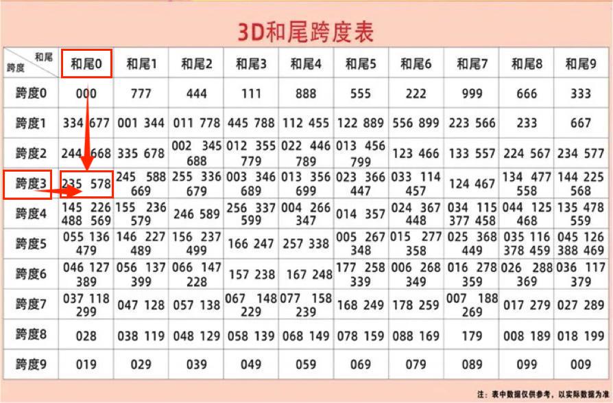最后分享一个实用的3D和尾值与跨度值组合统计表。组合号码时,根据推测的和尾值结合跨度值,查找统计表上推荐的组合号码。以26015期为例:和值尾0、跨度值3,在统计表上查找的组合号码有:235/578,其中组合号码中出235(开奖号码532)。特别注意:统计表上推荐的组合号码,不是直选号码,不定位百十个位的顺序。仅供参考。