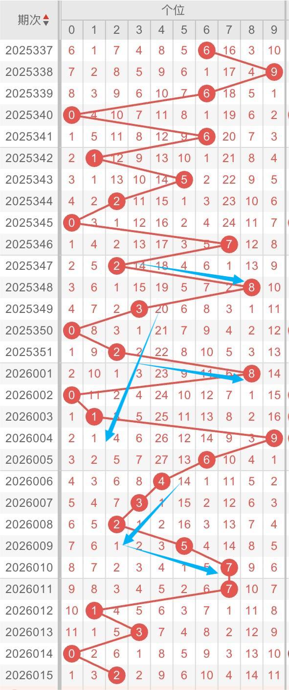 以近30期个位的走势形态分析:斜连和跨度交替出现。例如:数字2-3-4/6-7-8斜连开出,数字2-8/2-7跨度出现。本期重点关注:数字3-2-1斜连形态,同时关注2-7跨度开出。个人分析,仅供参考。