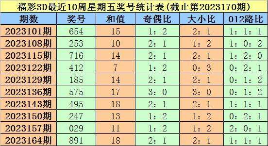 福彩3D第2023164期(上周星期五)奖号为891。其中奖号奇偶比为2:1,大小比为2:1,012路比为1:1:1。