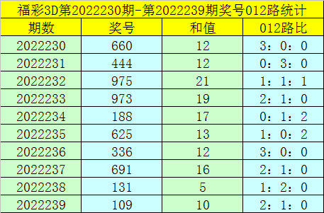 上期回顾:福彩3D第2022239期开出奖号:109。奖号为组六形态,与试机号有同号,奇偶比为2:1,大小比为1:2,012路比为2:1:0,和值为10,跨度为9。