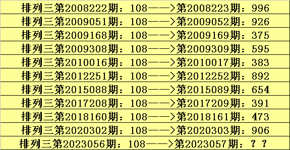 第2023056期排列三奖号为108,历史上该号码直选出现11次,下期奖号分别为:996、926、375、595、383、892、654、391、473、906。