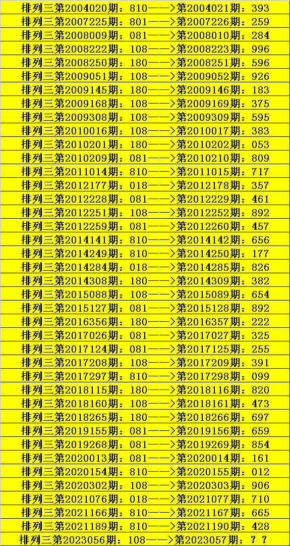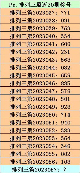 第2023056期排列三奖号为108,历史上该号码组选开出40次,下期奖号分别为:393、259、284、996、596、926、183、375、595、383、053、809、717、357、461、892、457、656、177、826、382、654、892、222、325、255、391、099、820、473、697、659、854、161、012、906、710、665、428。