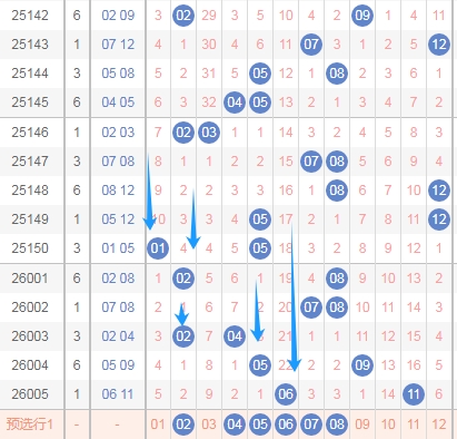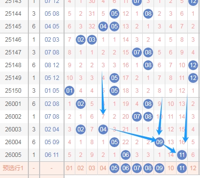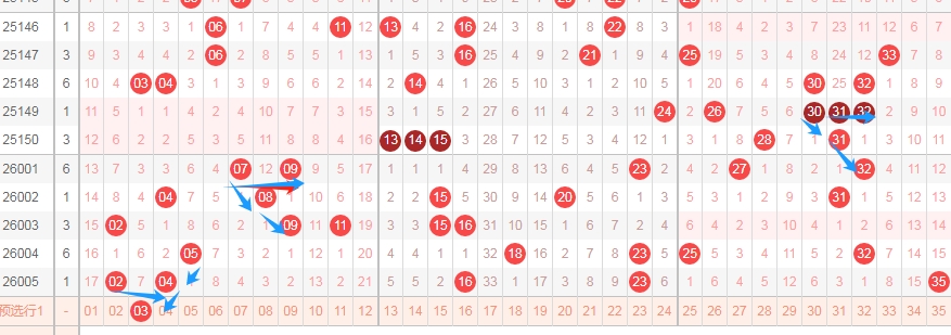 上图是体彩大乐透前区开奖号码分布图,你们看上面我画出来的蓝色小箭头,根据这些箭头的特点,那么本期留意一下数字03。