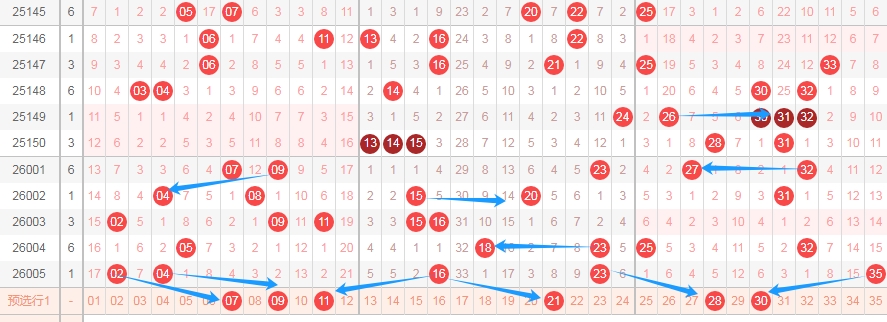 上图是体彩大乐透前区开奖号码分布图,你们看上面我画出来的蓝色箭头,根据这些蓝色的箭头的特点,那么本期这些数字07 09 11 21 28 30可以关注出2个或者3个吧!