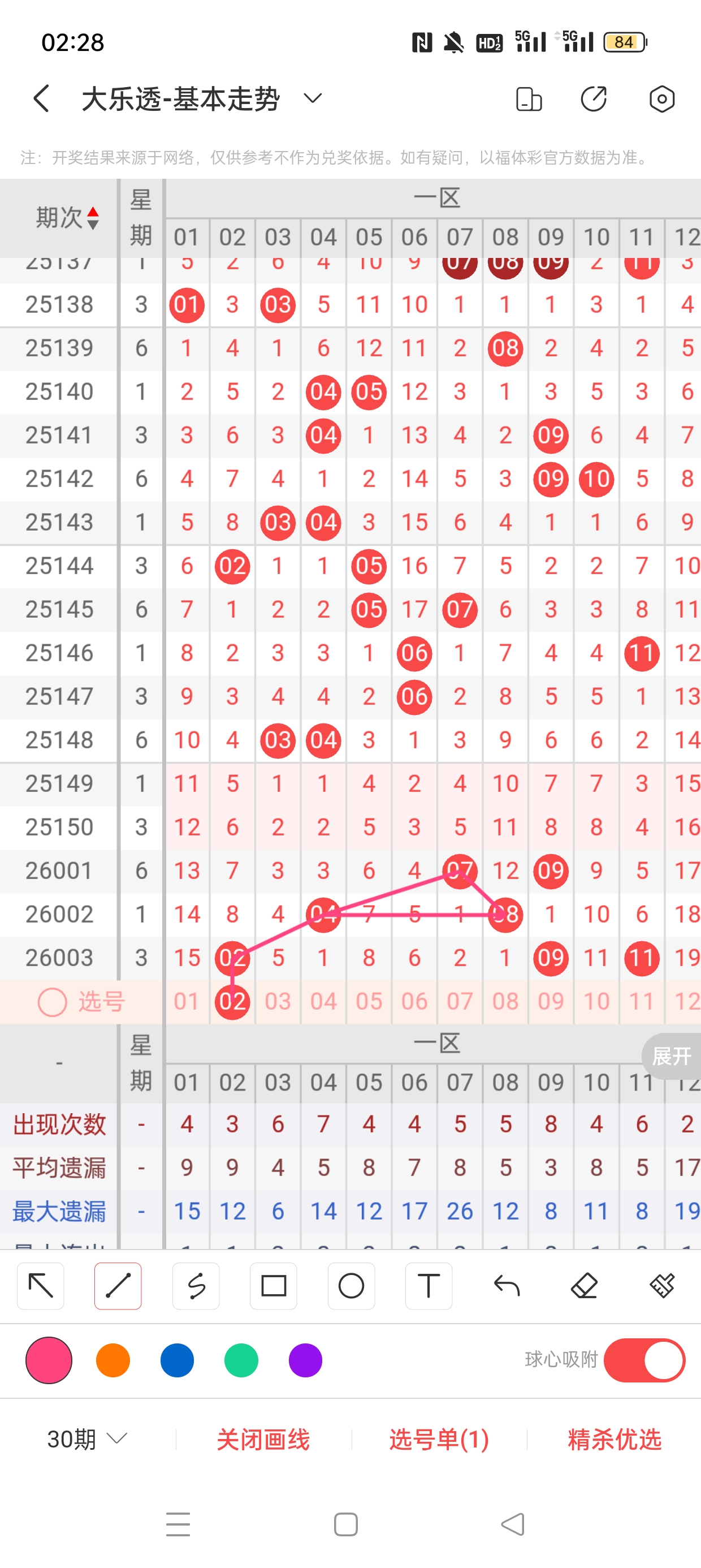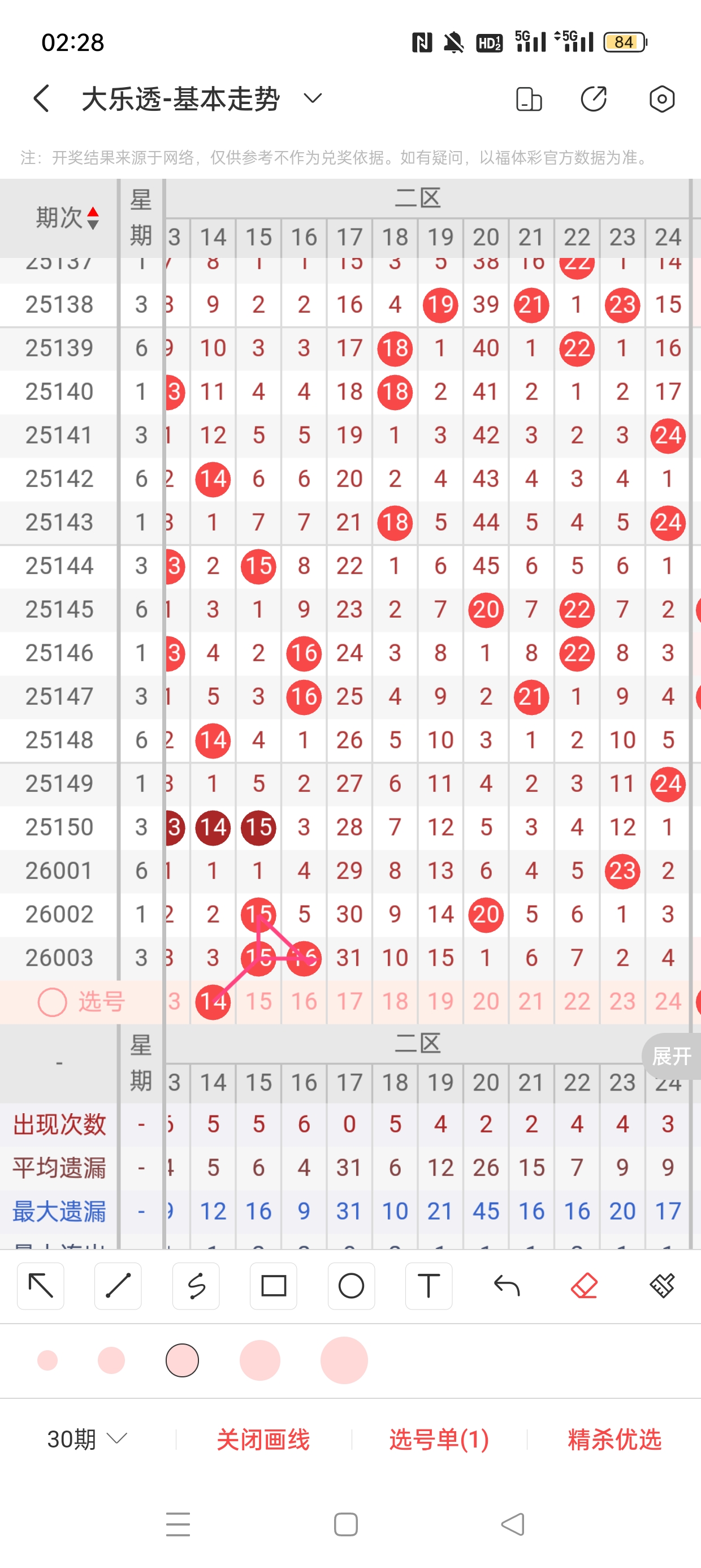 26003期开奖结果:2、9、11、15、16+2、4,奇偶比3:2,大小比0:5,和值53,012路212,邻孤传0邻4孤1传,同尾号无,传号15,连号15、16。总结完毕,下面开始本期分析。