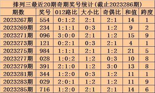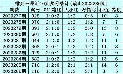 上期回顾:排列三2023286期奖号为116,奇偶比为2:1,大小比为1:2,跨度为8。