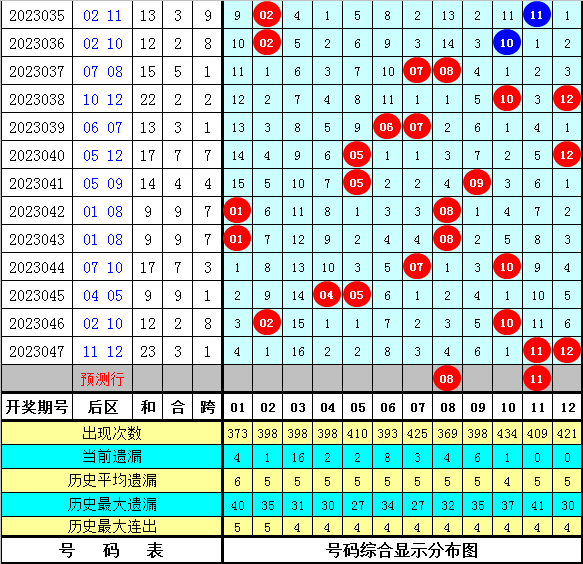 上期开奖:体彩大乐透第2023047期开奖号码为:10、12、13、24、25+11、12。前区五区比为0:3:0:2:0,和值为84,首尾间距为15,奇偶比为2:3,开出2个重号:13 25。后区号码和值为23,跨度为1。