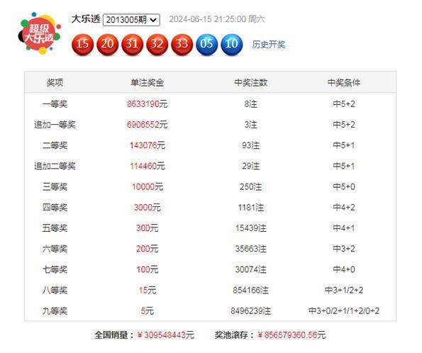 大乐透第2024068期开出奖号:前区15、20、31、32、33,后区05、10。当期前区012路比为2:1:2,奇偶比为3:2,和值为131,跨度为18,后区奖号出现在二、三区。