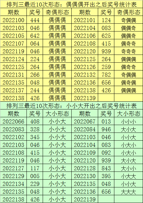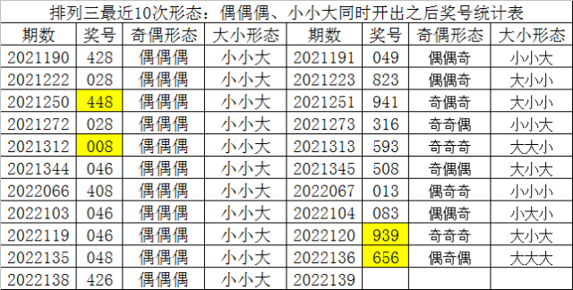 排列三最近10次同时开出奇偶形态:偶偶偶和大小形态:小小大时其奖号分别为:428-028-448-028-008-046-408-046-046-048-426,下期分别开出号码为:049-823-941-316-593-508-013-083-939-656,详细统计见下表: