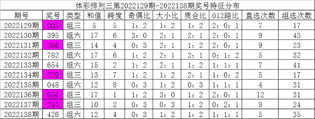 开奖回顾:体彩排列三第2022138期开出奖号:426。奖号基本特征为: