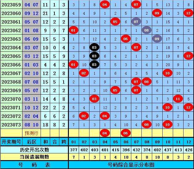 后区分析:后区上期开出2路和1路奖号08和10,最近20期后区奖号012路比为12:15:13,最近两周后区奖号012路比为2:5:5本期后区注意号码04、06、07、08、12,单挑两码注意0路号和1路号04、06。