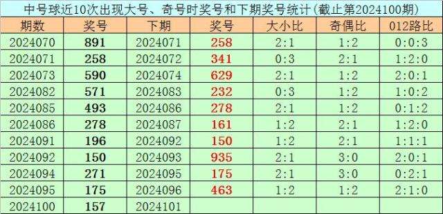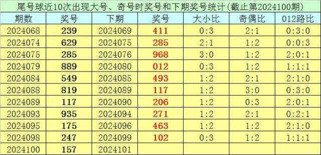 在尾号球前10次开出大号、奇号类型之后,其下期分别开出奖号:411、285、968、012、493、117、206、271、463、102,其中号码奇偶比为6:4,大小比为4:6,012路比为3:3:4。