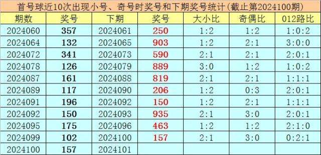 在首号球前10次开出小号、奇号类型之后,其下期分别开出奖号:250、903、590、889、819、206、150、935、463、157,其中号码大小比为5:5,012路比为2:3:5,奇偶比为5:5。