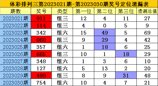 开奖回顾:排列三第2023030期奖号为:754,各位号码遗漏值分别为10、4、7,遗漏总值为21。