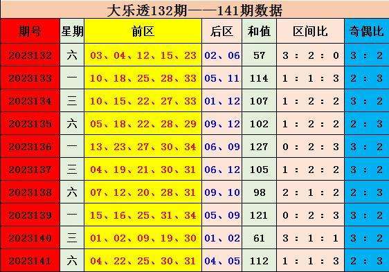 大乐透第2023141期奖号为:前区04 22 25 30 31,后区04 05。龙头:04,凤尾:31,区间比:1:1:3,奇偶比2:3,和值:112