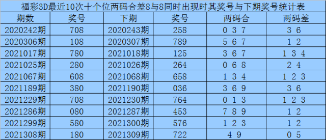 十个位合差分析:上期奖号十个位开出08组合,两码合为8,两码差为8,最近10次十个位两码合8与两码差8同时出现时,其奖号和下期奖号分别为: