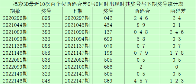 百个位合差分析:上期奖号百个位开出88组合,两码合为6,两码差为0,最近10次百个位两码合6与两码差0同时出现时,其奖号和下期奖号分别为:
