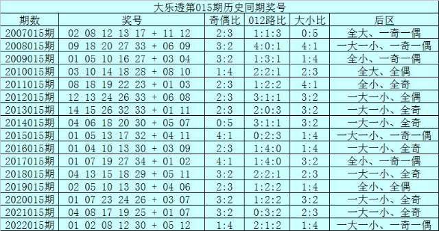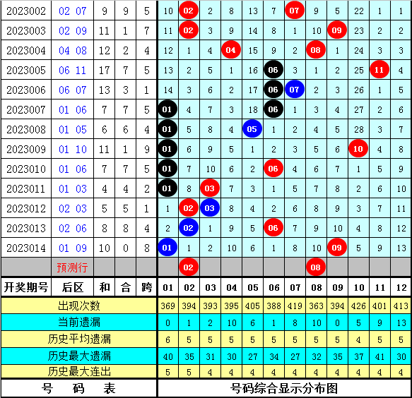 后区第二位分析:在历史第015期同期奖号中,后区第二位号码全部在02-12区段出现,其中该位号码012路比为6:5:5,奇偶比为9:7,大小比为12:4,本期第二位号码关注08。