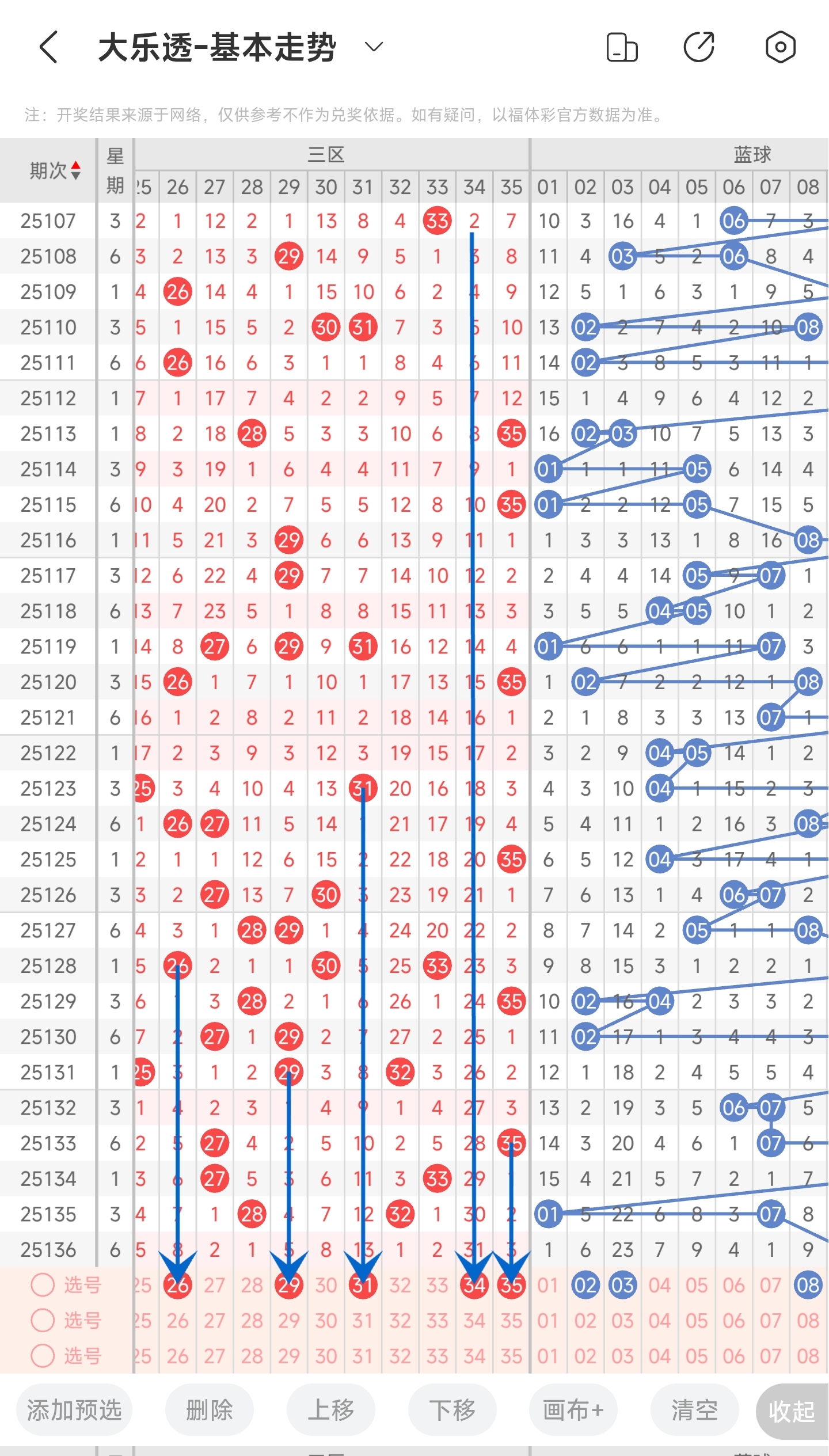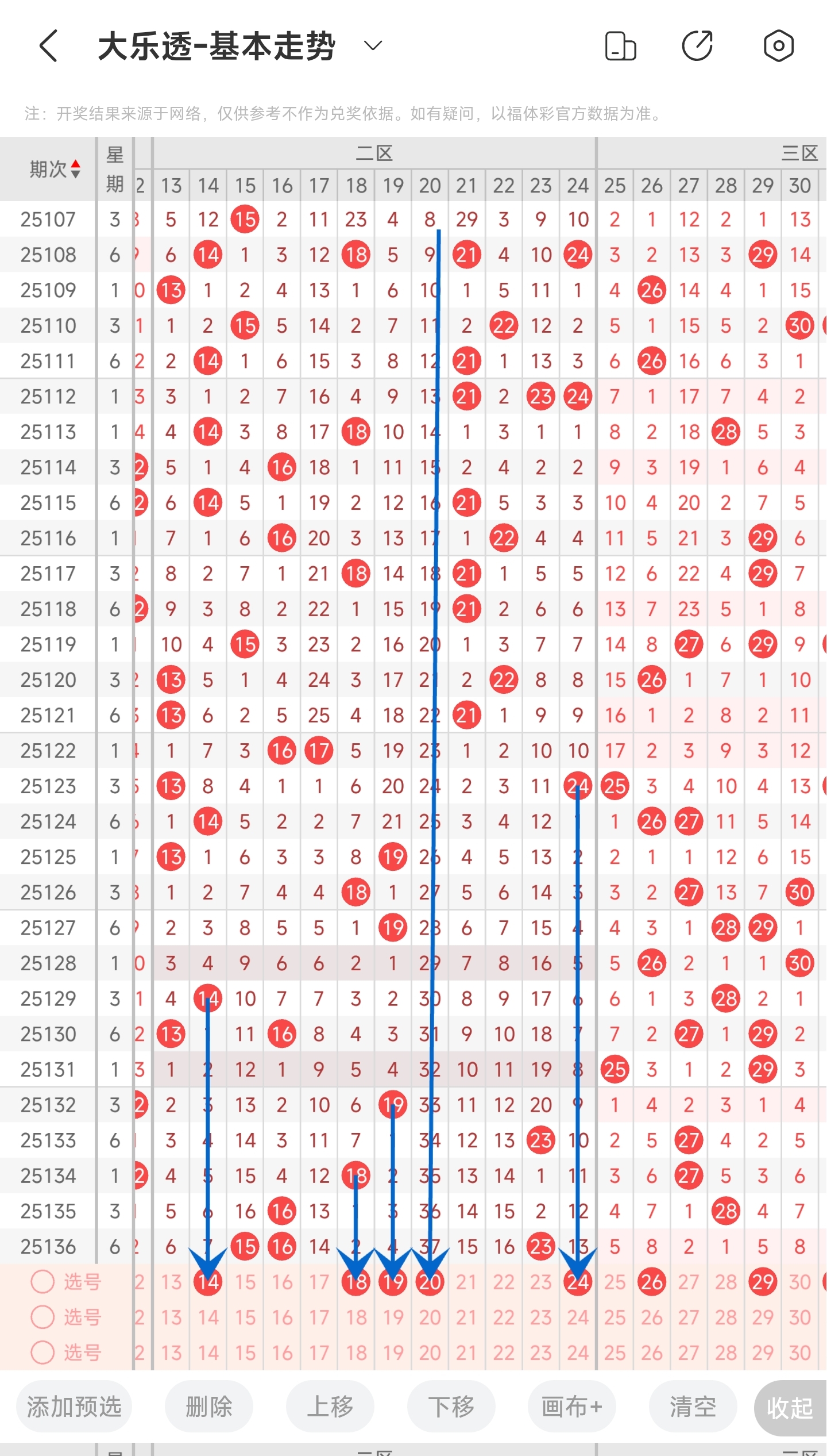 上期没有开出号码,往前一期开出了28,32号球。通过分析走势图,可以看到上期没有开出号码,本期大概率会回补号码。再从最近三区开号走势来看,中间的号码有回补趋势,本期要留意一下。凤尾的话,关注右边的号码,防一下34号球。最后再结合冷热号和遗漏期数,本期我们可以关注26,29,31,34,35等号。综上所述本期三区我们推测可能会开26,29,31,34,35等号码。