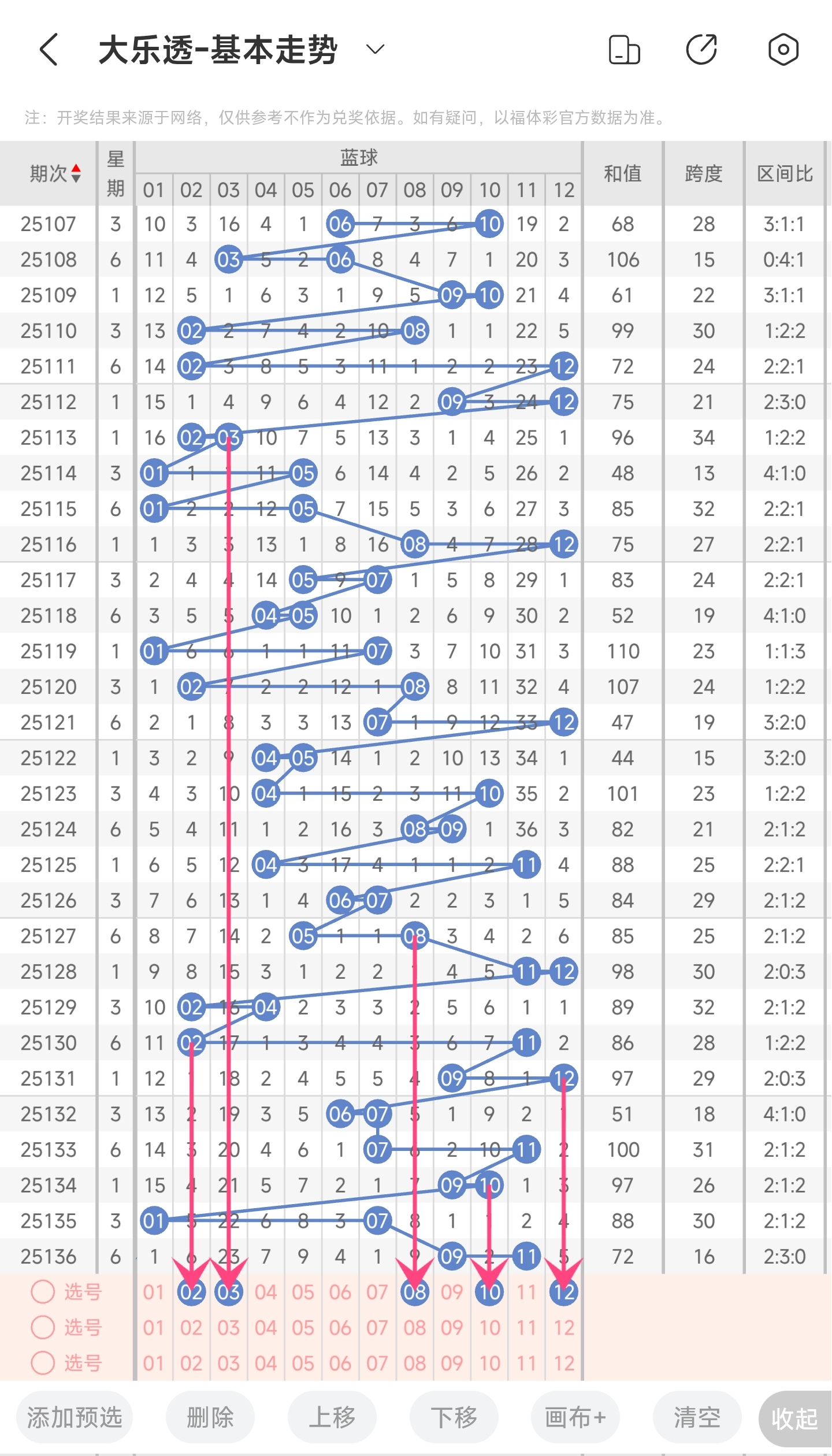 上期开出了9,11号球。往前一期开出了1,7号球。通过分析蓝区走势图,我们可以看到蓝区开出的号码跨度整体大多数情况下基本遵循一大一小这样子开。上期开了跨度比较小的号码。推测本期跨度大概率会变大,可以关注跨度比较大的号码。再从最近几期开的号码的奇偶来看,本期看好偶数。然后再结合冷热号情况以及遗漏期数,本期我们可以关注2,3,8,10,12等号。综上所述本期我们推测可能开出2,3,8,10,12等号码。