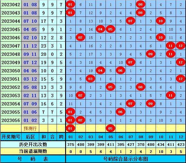 后区分析:后区上期开出1路+2路奖号01和02,最近20期后区0路奖号开出12个,1路奖号出现14个,2路奖号出现14个,最近8期后区0路奖号出现6个,1路奖号出现5个,2路奖号出现5个,本期后区注意号码:01、05、06、08、11,单挑两码组合01+05。