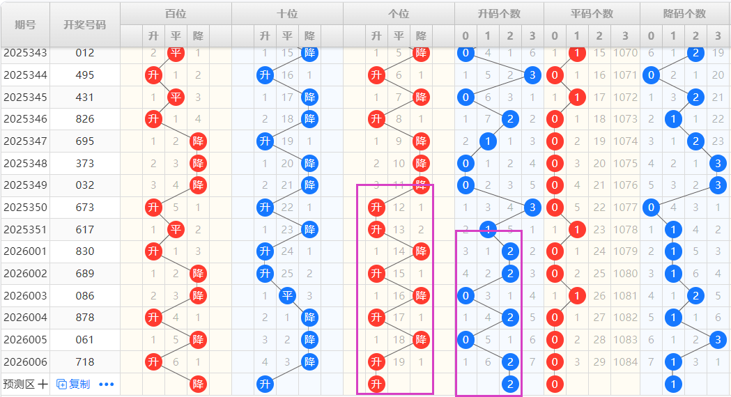 【排列3个位】:近期升降走势为:降-降-降-升-升-降-升-降-升-降-升,为一种交错走势,结合走势图可以看出,图中紫色框圈出为一种M形态的出球方式,本期可以重点看好升的形态号码的开出。