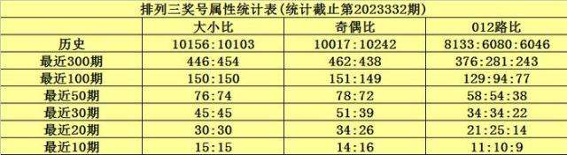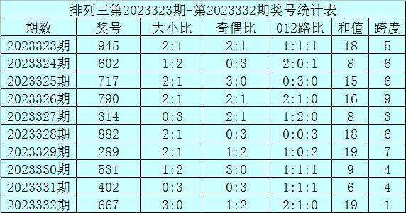 上期回顾:排列三第2023332期奖号为667,奖号012路比为2:1:0,奇偶比为1:2,大小比为3:0,和值为19,跨度为1。
