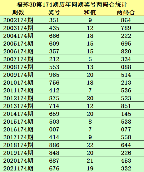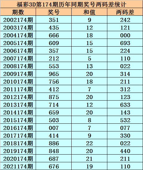 福彩3D第174期,历史上期开出20次奖号,其奖号分别为:351、435、666、609、357、212、553、965、756、412、875、714、659、503、007、414、886、848、687、676,奖号两码合差分别开出: