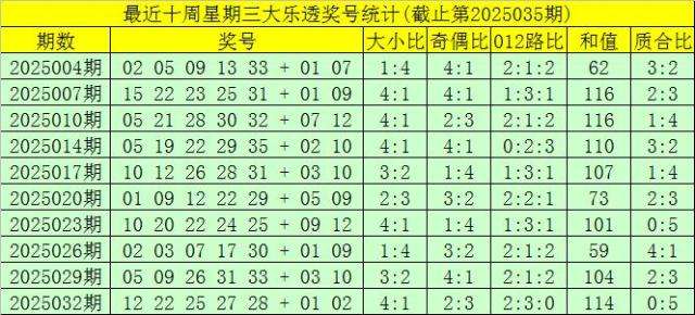 后区分析:最近10周星期三全大开出2次,全小开出1次,一大一小开出7次;全偶开出1次,一奇一偶开出5次,全奇开出4次,本期后区注意两码01+07。