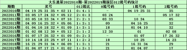 上期开奖:体彩大乐透第2022019期开奖号码为:01、04、07、17、21+01、02。前区五区比为3:0:2:0:0,和值为50,首尾间距为20,奇偶比为4:1,开出1个重号:21。后区号码和值为3,跨度为1。