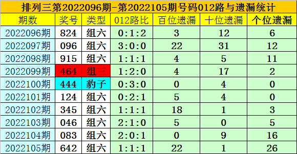 上期回顾:排列三第2022105期奖号开出642,奖号类型为组六,大小比为1:2,奇偶比为0:3,012路比为1:1:1。