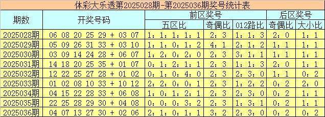 体彩大乐透第2025036期奖号为04 07 13 27 30 + 02 06,前区号码五区比为2:1:0:1:1,奇偶比为3:2,012路比为2:3:0,后区号码奇偶比为0:2,大小比为0:2。
