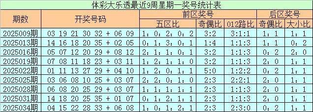上期回顾:体彩大乐透上周星期一(第2025034期)奖号为04 15 22 28 33 + 06 08,前区奖号五区比为1:0:1:2:1,奇偶比为2:3,012路比为2:3:0,后区奖号奇偶比为0:2,大小比为1:1。