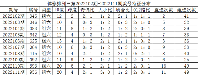 从统计表中可以发现,在和值15与跨度:5同时出现之后,下期跨度奇偶比为5:2,其下期奇数跨度走势活跃,短期内不会转冷,本期预计继续开出奇数跨度;