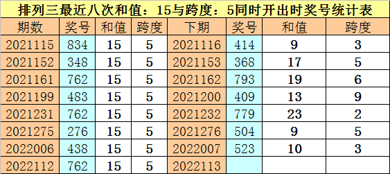 体彩排列三最近八次同时出现和值:15与跨度:5的奖号分别为:834、348、762、483、762、276、438、762,前七次下期开出奖号分别为:414、368、793、409、779、504、523,详见下表:
