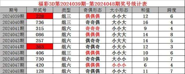 上期回顾:福利彩票3D第2024048期开奖结果128。奖号:奇偶偶、小小大,和值11,跨度7。